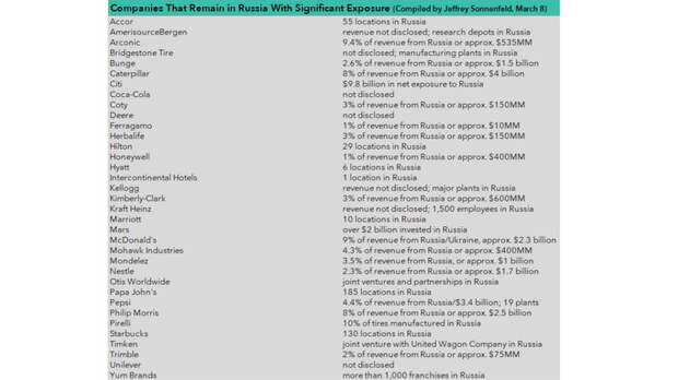 Порядка 35 крупных международных компаний намерены продолжить работать в России. Соответствующий список подготовил Джеффри Зонненфельдом со своей исследовательской группой Йельского института. В частности, в России останутся такие компании, как Coca-Cola, Herbalife, Hilton, Hyatt, Lexus, Mars, McDonaldʼs, Nestle, Papa John’s, Pepsi, Philip Morris, Pirelli, Starbucks, Toyota и Unilever. В то же время уже покинули Россию из-за конфликта на территории Украины порядка 250 компаний с мировым именем. Напомним, ранее сообщалось, что Pizza Hut и KFC приостанавливают инвестиции и развитие в России.